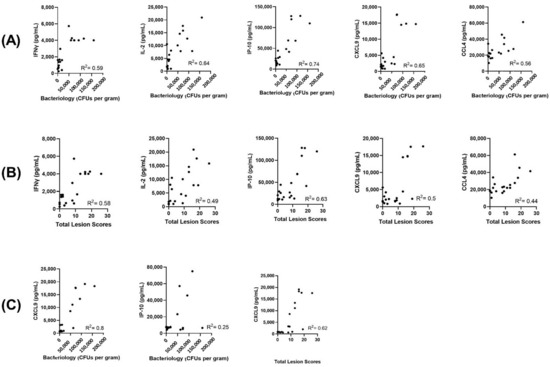 Correlations of host proteins’ concentrations (x-axis) with bacteriology counts (A) and total lesion scores (B) for PPDB-stimulated whole blood supernatants and (C) for serum at necropsy for M. bovis challenged animals. Bacterial counts and total lesions scores were determined as previously described [41]. R2 is the square of Pearson correlation coefficient.