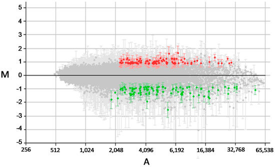 Data acquisition was carried out with a GenePix 4100A instrument (Axon, Foster City, CA, USA). The raw data of local feature background medians were subtracted using GenePix Pro 7.0 software (Axon, Foster City, CA, USA). Normalization was performed with the LOWESS per pin algorithm and statistical inference with the paired Student’s t-test by using AlmaZen software (BioAlma, Tres Cantos, Spain). The cutoff values for differential gene expression were defined as follows: (i) fold change F ≥ 1.8 (Cy5/Cy3 ratio if Cy5 > Cy3) or F ≤ −1.8 (−Cy3/Cy5 ratio if Cy3 > Cy5), (ii) total relative fluorescence intensity value >5000 arbitrary fluorescence units, and (iii) p < 0.05. Three biological replicates of the experiment were performed.