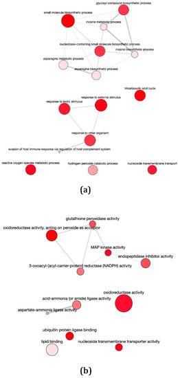GO enrichment analyses of Biological Process (GOBP) and Molecular Function (GOMF) terms were performed. The set of genes up-regulated in pTEX-DEVH1 promastigotes is enriched in GOBP terms related with localization and maintenance of proteins and other macromolecules in the cell, metabolism, signaling, and mRNA processing (Figure 2a and Figure S2). The GOMF enrichment analysis indicates that the terms RNA helicase activity and ATP-dependent activity acting on RNA are over-represented in the set of genes up-regulated in pTEX-DEVH1 promastigotes, as well as terms related to transport and intracellular vesicle trafficking (Figure 2a and Figure S2). Significantly over-represented GOBP terms in the set of genes down-regulated in pTEX-DEVH1 promastigotes include response to biotic stimulus; response to other organism; evasion of host immune response via regulation of the host complement system; catabolic processes related with reactive oxygen species (ROS), such as hydrogen peroxide; and nucleotide and amino acid biosynthetic processes (Figure 3a and Figure S3); among others. These terms are related to GOMF terms, such as glutathione peroxidase activity, oxidoreductase activity on peroxide acceptors, other oxidoreductase activities, and ammonia ligase activity (Figure 3a and Figure S3).