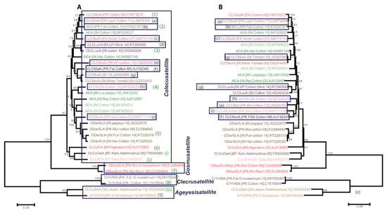 Maximum likelihood phylogenetic tree of alphasatellites isolated from cotton. The numbers at different nodes represent the 1000 bootstrap replication values. Nine different alphasatellites (1)–(9) were reported in cotton crop from around the world, while three alphasatellites (i, ii and iii) were associated only with cotton leaf curl geminiviruses and were not identified in cotton. Panel (A) represents the full-length molecules representative of those shown in Supplementary Figure S1, while panel (B) shows the phylogenetic tree of the Rep genes used in panel (A). Different clusters representing each strain of CLCMulA are indicated with lowercase letters (a–i) and a rectangular box. Each alphasatellite is represented with a unique color. Members of the genera Colecusatellite, Gosmusatellite, Clecrusatellite and Ageyesisatellite infect cotton crops around the world.