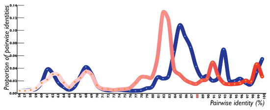 Pairwise sequence comparison (PASC) was used to analyze the nucleotide diversity of alphasatellites at the species and genus level. Briefly, the full-length genomes (n = 420) reported from cotton were analyzed for sequence similarities in the SDT program [28]. The alpha-Reps of all the alphasatellites (n = 420) were also isolated for each accession, and their identity percentage values were calculated using the SDT program. A matrix of pairwise sequence identity calculated using SDT (MUSCLE module) was used. The identity percentage values and their frequency distribution were transferred to a spreadsheet to plot the PASC, as described previously in [32].