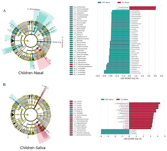 The distribution of the high relative abundance of bacteria at the genus level in the nasal cavity of the two groups is described in Figure 1C. The top three genera in the nasal cavity in relative abundance were Pseudomonas, Dolosigranulum, and Moraxella in healthy children, with Pseudomonas, Serratia, and Streptococcus in CP children. The communication between the oral and nasal cavities caused by CP provided more possibilities for the translocation of bacteria between these two ecological niches. To further explore CP-related bacterial changes, linear discriminant analysis effect size (LEfSe) was performed based on the linear discriminant analysis (LDA) score. The results identified special bacterial biomarkers at the genus level of CP/healthy children (LDA score > 2.0, p < 0.05) (Figure 2A,B and Table S3). At the genus level, ten taxa in nasal were overabundant in CP children including Granulicatella, Actinomyces, Atopobium, Gemella, Veillonella, Rothia, Prevotella, Haemophilus, Staphylococcus, and Streptococcus, and five taxa in oral were overabundant in healthy children (Table S3). Interestingly, we found that bacterial biomarkers such as Streptococcus, Gemella, Veillonella, Prevotella, and Haemophilus in the nasal cavity of CP children were the dominant bacteria in the oral cavity (relative abundance > 1%). However, little or none of them occurred in the nasal cavity of healthy children in our data (Figure 1C and Table S3). Significantly, Streptococcus even became the third most abundant bacterial species in the nasal cavity of CP children. In general, all the results showed that some oral resident bacteria had an abnormally high abundance in the nasal cavity of CP children, which might significantly interfere with the nasal microecosystem.