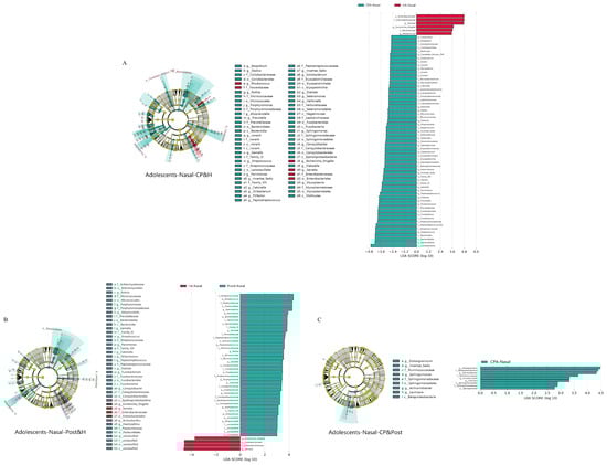 Distinct genera between the CP, postoperative, and healthy adolescents. (A–C) Linear discriminant analysis effect size (LEfSe, α = 0.05, log10 LDA score > 2.0) revealed 21 and 14 genera (green) with greater relative abundance in the CP and postoperative than the healthy group of nasal bacteria. There are only 4 genera with greater relative abundance in the CP group than postoperative group. H: healthy. CP: cleft palate. Post: postoperative.