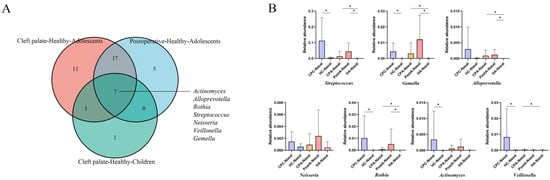 Characteristics of TS O-N bacs in children and adolescents. (A) Venn diagram revealed there were seven TS O-N bacs in children and adolescents. (B) Changes in relative abundance of seven TS O-N bacs in nasal of five populations (CP and healthy children; CP, healthy, and postoperative adolescents). The p values were obtained by LEfSe (* p < 0.05, α = 0.05, log10 LDA score > 2.0).