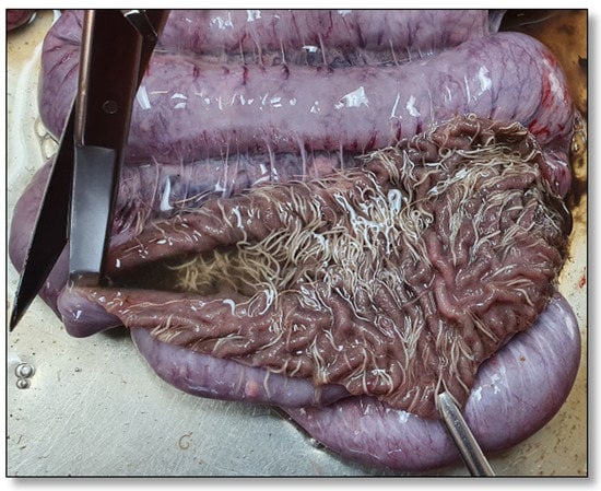 - Brewer, M.T.; Greve, J.H. Internal Parasites. In Diseases of Swine, 11th ed.; Zimmerman, J.J., Karriker, L.A., Ramirez, A., Schwartz, K.J., Stevenson, G.W., Jianqiang, Z., Eds.; Wiley-Blackwell/American Association of Swine Veterinarians: Hoboken, NJ, USA, 2019; pp. 1028–1040. ISBN 978-1-119-35090-3. [Google Scholar]