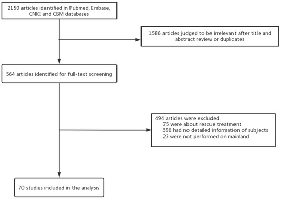 We searched 2150 articles, and 70 articles were enrolled in the study (Figure 1). Among the included studies, 21 were from northern China, 27 were from eastern China, 8 were from southern China, 7 from western China and 7 studies were multicenter studies (Table 1).