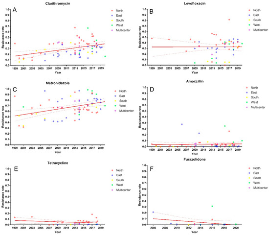 Primary clarithromycin (A), metronidazole (B), levofloxacin (C), amoxicillin (D), tetracycline (E) and furazolidone (F) resistance of H. pylori in China.