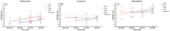 Time trends of primary clarithromycin (A), metronidazole (B) and levofloxacin (C) resistance in different regions of China.