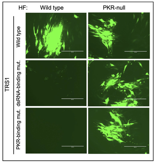 HCMV replication depends on TRS1 binding to dsRNA and to PKR. HF or PKR-null HF were infected with recombinant HCMVs containing EGFP and wild-type TRS1 or triple residue mutations that eliminate binding to either dsRNA or PKR. Plaques were photographed 8 days after infection (bar = 400 μm, [11,41], and unpublished data).
