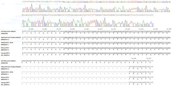 APA StyleHien, N. D., Nguyen, L. T., Hoang, L. T., Bich, N. N., Quyen, T. M., Isoda, N., & Sakoda, Y. (2022). First Report of a Complete Genome Sequence of a Variant African Swine Fever Virus in the Mekong Delta, Vietnam. Pathogens, 11(7), 797. https://doi.org/10.3390/pathogens11070797