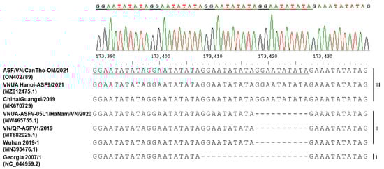 - Tran, H.T.T.; Truong, A.D.; Dang, A.K.; Ly, D.V.; Nguyen, C.T.; Chu, N.T.; Hoang, T.V.; Nguyen, H.T.; Dang, H.V. Circulation of two different variants of intergenic region (IGR) located between the I73R and I329L genes of African swine fever virus strains in Vietnam. Transbound. Emerg. Dis. 2021, 68, 2693–2695. [Google Scholar] [CrossRef]