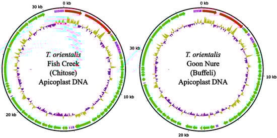 Apicoplast genomes of T. orientalis Fish Creek and Goon Nure isolates. Outer ring (black) represents DNA sequence. Middle ring shows annotated genes including ribosomal RNA subunits (red), transfer RNA (purple) and protein coding sequences (green). Inner ring shows %GC difference from average with a 100 bp sliding window.