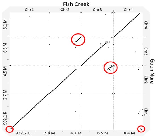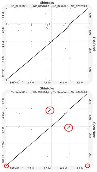 Synteny dot plots of the T. orientalis Shintoku (Ikeda) reference and strains Fish Creek (Chitose) and Goon Nure (Buffeli). Red circles indicate rearrangement in strain Goon Nure between chromosomes 2 and 3 and translocation between chromosomes 1 and 4.