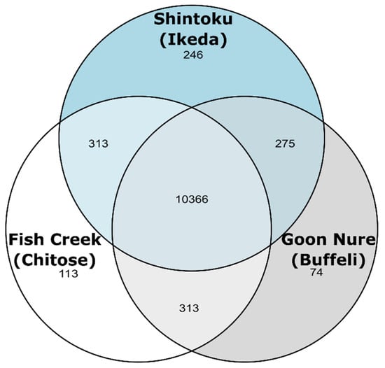 Evidence-based annotation produced 3980 and 3924 genes in the Fish Creek and Goon Nure strains, respectively, as compared to 4058 genes identified in the Shintoku reference annotation (Table 3). Ortholog clustering of the cumulative 11,757 coding genes showed that 10,366 had orthologs in all three isolates and 901 had orthologs in two (Figure 3). A total of 246, 113, and 74 genes were identified as being unique to the Shintoku, Fish Creek, and Goon Nure isolates, respectively.
