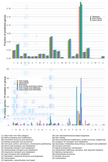 COG analysis of all predicted genes (top); genes identified as unique to each isolate combination (middle). Genes without COG assignment are not shown but consist of 31–38% of the total gene content of each isolate. COG categories (x-axis) are summarised by their letter categories (bottom).