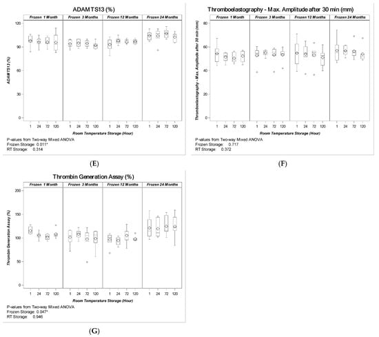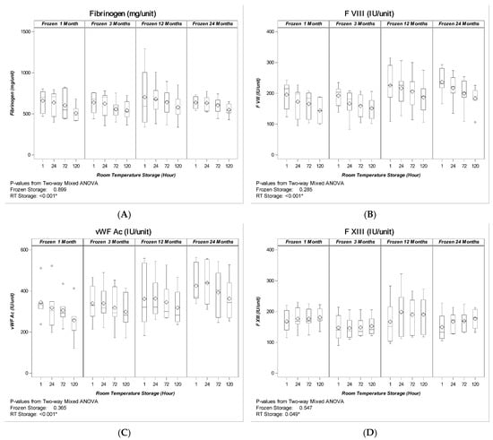 - Lokhandwala, P.M.; O’Neal, A.; Patel, E.U.; Brunker, P.A.R.; Gehrie, E.A.; Zheng, G.; Kickler, T.S.; Ness, P.M.; Tobian, A.A.R. Hemostatic profile and safety of pooled cryoprecipitate up to 120 hours after thawing. Transfusion 2018, 58, 1126–1131. [Google Scholar] [CrossRef] [PubMed]