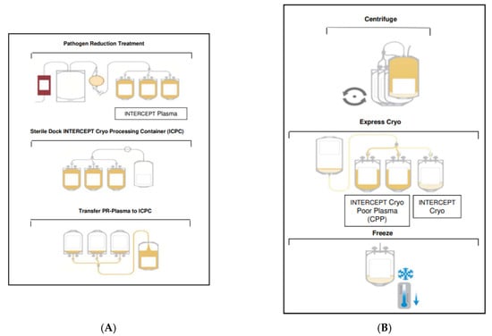 - Cid, J.; Caballo, C.; Pino, M.; Galan, A.M.; Martínez, N.; Escolar, G.; Diaz-Ricart, M. Quantitative and qualitative analysis of coagulation factors in cryoprecipitate prepared from fresh-frozen plasma inactivated with amotosalen and ultraviolet A light. Transfusion 2013, 53, 600–605. [Google Scholar] [CrossRef]