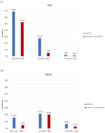 Prevalence of overall and resistance conferring RAS according to geno2pheno [HCV] algorithm and HCV genotype in: (a) NS3 region (b) NS5A region.