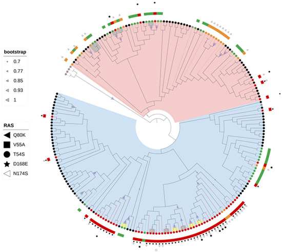 Maximum likelihood phylogenetic analysis of the NS3 gene sequences of HCV 1a subtype constructed with GTR+G+I model and 1000 bootstrap replicates. Bootstrap values between 70 and 100% are displayed at the branch nodes as blue triangles with size corresponding to magnitude of bootstrap. Branches of two most similar control sequences per each local sequence obtained by searching the BLAST database and removing duplicates are colored black. Branches of Croatian sequences without RAS are colored green, sequences with RAS conferring resistance to DAA are colored red, and sequences with RAS associated with reduced susceptibility to DAA are colored orange. Reference sequences are colored gray. Clade I sequences are highlighted blue, while clade II sequences are highlighted pink. All identified RAS are positioned on the phylogenetic tree along with the corresponding sequences. Resistance conferring RAS are marked with filled symbols, while RAS causing reduced susceptibility to at least one DAA are marked with open symbols. Identified transmission pairs are highlighted gray, while transmission pairs identified consistently across all genomic regions for GT1a are highlighted yellow.