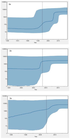 Bayes factor (BF) analysis favoured the relaxed lognormal molecular clock and the Bayesian skyline demographic model for all subtypes which were thus used for subsequent analysis (Supplementary Materials Tables S1–S3). The mean estimated substitution rates of the GT1a, GT1b, and GT3a sequences were 1.48 × 10−3 (95% HPD, 0.52–2.40 × 10−3), 3.78 × 10−3 (95% HPD, 1.30–6.59 × 10−3), and 2.04 × 10−3 (95% HPD, 0.47–3.67 × 10−3), respectively. The mean estimates for the tMRCA of the analysed sequences were 1960 (95% HPD, 1911–1994) for subtype 1a, 1994 (95% HPD, 1973–2009) for subtype 1b, and 1978 (95% HPS, 1933–2004) for subtype 3a (Table 6). The Bayesian skyline plots (BSP) of the analysed dataset are shown in Figure 4. The skyline profile of the GT1a dataset shows a steady nonexpanding phase until the 1990s followed by an exponential increase in HCV infections from the 1990s to mid-2000s. Similarly, GT3a BSP shows expansion of the population size since tMRCA in the late 1970s and its stabilisation in the last decade. GT1b BSP shows a relatively constant population size from tMRCA in the early 1990s to the present time with a slight increase in the first decade of the 21st century.