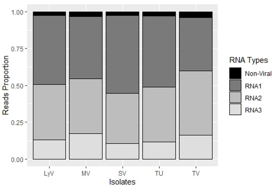 The particle heterogeneity was analyzed, based on the number of reads (Table S1, Supplementary Materials) that were mapped to RNA1, RNA2 and RNA3, assuming that in bromoviruses the respective RNA components are packaged into separate virions [10]. The RNA1-bearing particles were the most abundant in the four isolates, LyV, MV, SV and TU, followed by RNA2 and RNA3, whereas in isolate TV, the RNA2 segments were the most abundant, followed by RNA1 and RNA3. In isolate SV, the difference in the RNA1 to RNA2 ratio was the highest among the five isolates (Figure 2; Table S2). Such a heterogeneous distribution of particles in the infected plants might influence the disease progression, including the differences in symptom severity among the different isolates shown by Makkouk et al. (1989) [3]. In brome mosaic virus (BMV), the host–RNA interactions led to particle heterogeneity that affected the timing of infection, due to an altered dissociation of CP to release the viral RNAs [10,11].