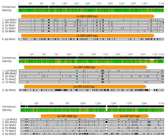 Multiple sequence alignment (MSA) of nucleotide sequences of BBMV RNAs 1, 2, and 3 (top to bottom) for five BBMV isolates as compared to Ba ones. The orange bars represent the ORF regions (with the length shown in parentheses). The gray regions signify identical nucleotides, while the nucleotide substitutions are depicted by the black vertical lines and the deletions by the horizontal black lines. The green bars illustrate the regions of identity.