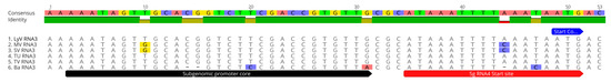 Besides the poly A variation, the rest of the IGR was largely conserved in BBMV, with only 10 SNPs among the five isolates. In BMV and CCMV, the sg promoter consisted of a “core” sequence that preceded the sgRNA4 initiation site. The corresponding initiation site in the five new isolates aligned with the previously mapped site in Ba [6], but with some variation within the core (Figure 4), that might affect the transcription of sgRNA4.