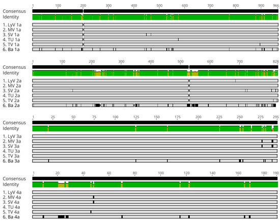 MSA of amino acid sequences of proteins 1a, 2a, 3a and 4a (CP) for six BBMV isolates. The gray regions represent identical nucleotides, while the aa substitutions are depicted by the black vertical lines and the deletions by small gaps. The green bars illustrate the regions of identity. The numerical scale on top marks the positions of amino acids.
