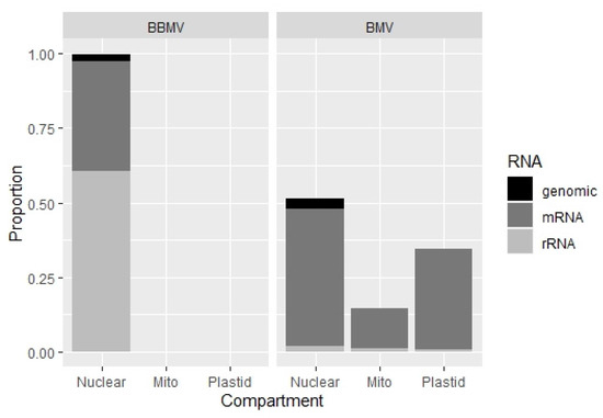 Previously, we demonstrated that BMV can encapsidate nearly 0.1% of host (cellular) RNAs, including rRNAs and mRNAs, nuclear and organellar, transposable elements and retro-transposons [27]. Here we find that the BBMV packages a 10 to 20 times (between 1.14 to 1.95%) higher content of the host RNAs. Table S2 (Supplementary Materials) summarizes the numbers of reads mapped to various categories, whereas Table S3 (Supplementary Materials) shows that over 99% of the host reads were of nuclear origin; in BMV, 50% of the reads were from nuclear RNAs and the rest from mitochondria and plastids (Figure 7; Table S3). Among the most mapped total 17 transcripts (Table S4, Supplementary Materials), although there was some variability in their concentration (based on the number of reads), five isolates encapsidated the photosystem repair protein and ribosomal protein S25, followed by aldolase, heat shock and GTP-binding proteins; the transposable elements (TEs) included retrotransposons Class 1 (LINE and LTR), and some of the Class 2 Res (Table S5). One can speculate that these differences originate either due to the distinct affinities of viral CPs with the RNA types, due to different replication sites, or because of host-specific factors. It seems that the encapsidation in the different bromoviruses might use different specificity-based mechanisms of RNA packaging. The study of the host RNA encapsidation by BBMV will be extended further to address the subject in more detail. Future analyses, including the isolate Ba, will involve the validation of host RNAs by Northern blotting, and the possibility of artifacts from residual RNAs after nuclease treatment.