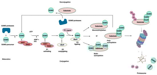 SUMOylation: the Small Ubiquitin-related Modifier (SUMO) pathway. SUMO proteins are processed by a SUMO-specific protease at the C-terminal tail to expose a diglycine (-GG) motif, resulting in a mature SUMO peptide. SUMO is subsequently activated in an ATP-dependent reaction, creating an intermediate thioester bond between the active site of SUMO and the heterodimeric E1-activating enzyme (SAE1/SAE2). Following activation, SUMO is transferred from the E1 enzyme to Ubc9, and finally attached to a target lysine in the protein substrate, which is usually located within the consensus site. This final step is mediated by E3 ligase enzymes that function in substrate recognition and specificity. SUMOylation is reversible (deconjugation), and the same SUMO proteases involved in SUMO maturation catalyze the removal of SUMO from the target substrate. Cross-talk exists between SUMOylation and ubiquitylation through SUMO-targeted ubiquitin ligases (STUbLs). STUbLs are enzymes that catalyze the addition of ubiquitin to proteins that have been previously SUMOylated with SUMO chains. STUbL activity results in target proteins that are modified by both SUMO and ubiquitin, which can be targeted to the proteasome for degradation. AMP: adenosine monophosphate; PPi: pyrophosphate; Ub: ubiquitin. Adapted with permission from [26] 2021, Springer Nature. Figure was created with Biorender.