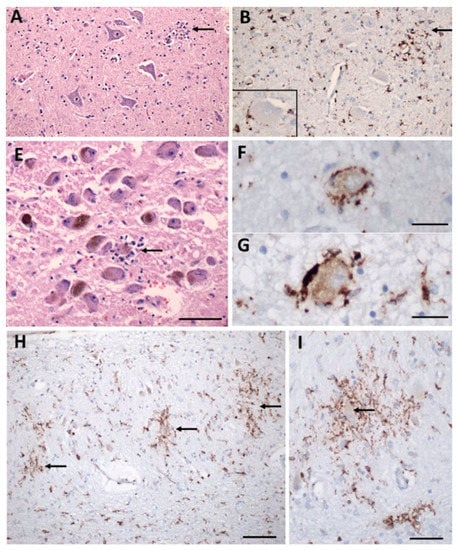 Inflammatory pathology in COVID-19 brains. (A) Section of the hypoglossal nucleus shows several motor neurons and a microglial nodule (arrow). (B) An adjacent section immunolabeled for CD68 (brown) shows clustered microglia within the nodule. Inset: Microglia in close apposition to a hypoglossal neuron (CD68+). (E) The locus coeruleus contains a microglial nodule with a degenerating neuron in the center, identified by its residual neuromelanin (arrow). (F,G) Neurons of the dorsal motor nucleus of the vagus surrounded by CD68+ microglia. (H,I) Microglial nodules in the dentate nucleus (arrows in (H)), neuron in the middle of a nodule (arrow in (I)), CD68. Scale bar in (A,B) = 200 µm; (E) = 10 µm; (F,G) = 50 µm; (H) = 100 µm; (I) = 50 µm. Adapted with permission from [61] 2021, Oxford University Press. Panels C, D, J, K from the original publication are not shown.