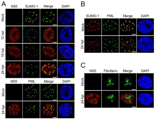 SUMO proteins have been shown to interact with ZIKV, particularly the non-structural-5 (NS5) viral protein [74]. NS5 encodes both viral methyltransferase and RNA-dependent RNA polymerase. This protein is important in viral replication and to ensure viral survival and replication by inhibiting the host’s innate immune system [75]. Despite flaviviruses replicating in the cytoplasm, NS5 proteins of ZIKV are predominantly located in the nuclei of infected cells [74]. Multiple sequence alignments of over 400 pre-epidemic and epidemic ZIKV strains revealed a putative SUMO-interacting motif (SIM) at the N-terminal domain of NS5 [74]. NS5 is stabilized by SUMOylation and is critical for the persistent ZIKV infection of human brain microvascular endothelial cells (hBMECs) [76]. Specifically, during ZIKV infection, SUMOylation of NS5 decreases its ubiquitin-mediated degradation and promotes its interaction with the signal transducer and activator of transcription-2 (STAT2) protein, which disrupts the host antiviral promyelocytic leukemia (PML)-STAT2 nuclear bodies (NBs) and leads to the degradation of PML [76]. In fact, as previously reported by Conde et al., NS5 forms SUMO-1-co-localized and SUMO-1-independent nuclear speckles during ZIKV replication in human brain microvascular endothelial cells (Figure 4). Following ZIKV infection, distinct nuclear speckles of NS5 were observed in the nucleus of hBMECs that co-localized with SUMO1 (Figure 4A). Importantly, ZIKV infection reduced the association of SUMO1 with PML and reduced PML expression levels (Figure 4B). Given that PML promotes the transcription of interferon-stimulated genes (ISGs), PML degradation leads to a disruption in type-I interferon signaling, fostering a favorable environment for viral persistence and pathogenesis [77].