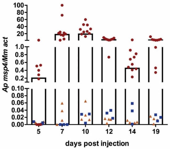 A. phagocytophilum infection in C3H/HeN mice. The course of infection in mice injected with (■) HL-60 cells infected with A. phagocytophilum from frozen stock, n = 3; (▲) in vitro culture of HL-60 cells infected with A. phagocytophilum, n = 4; and (●) infected blood from SCID mice, n = 10. Infection was monitored by qRT-PCR starting at 5 dpi; measurement was finished at 19 dpi. Each data point represents the relative quantification of the A. phagocytophilum msp4 gene normalized to mouse actin. The columns represent the average of the individual data points for mice injected with infected blood from SCID mice. n = number of mice.