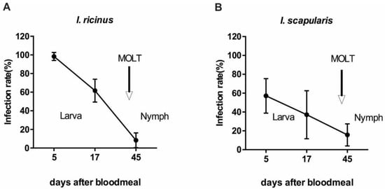The infection rate of A. phagocytophilum during larval to nymphal development. (A) I. ricinus, (B) I. scapularis. Infection rates gradually decreased in both tick species during molting to nymphs. Each data point represents at least 70 individually analyzed ticks. Error bars represent mean with 95% CI.