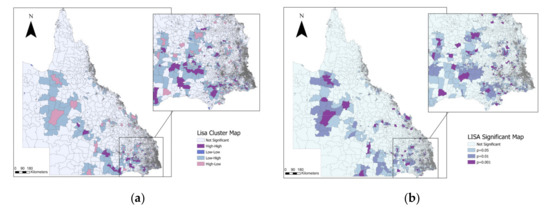 Local Indicators of Spatial Association (LISA) cluster map for the cumulative Q fever incidence in Queensland between 2002 and 2017. (a) Distribution of LISA clusters; (b) distribution of statistically significant LISA clusters.