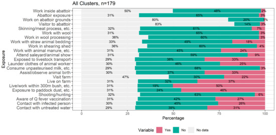 Our analysis of the exposure responses of Q fever cases between household and community clusters detected by space–time analysis is summarized in Figure 2, and represents all different types of exposure reported by 179 cluster-associated cases. A total of 50% of recorded cases answered positively to living or working within 300 m of bush, followed by exposure to paddock dust (46%), and being exposed to livestock transport, and assisting/observing animal birth (33%). On the other hand, only 3% of recorded cases reported abattoir exposure and 1% reported working in the grounds of an abattoir.