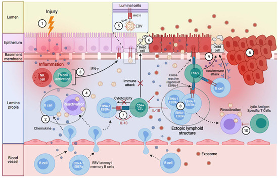 Figure 1. Sequence of EBV infection, chronic inflammation, autoimmunity, and/or cancer in the mucosa of genetically predisposed patients. (1) An infection or any inflammatory stimulus recruit leukocytes in the mucosa, including both latency I B cells (EBNA-1) and healthy B cells. (2) In the mucosa, B cells form ectopic lymphoid aggregates that allow for the generation of antigen-specific immune responses. These ectopic lymphoid structures generate a favorable environment for the transformation of EBV-latent B cells into proliferating blasts, to become memory B cells. (3) In addition, NK cell activation occurs, both in response to the first inflammatory stimulus, and to restrict B cell transformation by EBV. Exposure to foreign antigens from the first stimulus or to viral antigens from EBV leads to activation of CD4 T cells and release of IFN-γ, followed by upregulation of MHC-II on epithelial cells, which favors the acquisition of a nonprofessional antigen-presenting cell phenotype. (4) In addition, the presence of foreign antigens could also lead to terminal differentiation and activation of EBV-latent B lymphocytes, allowing the transition from the latent to the lytic phase of the virus. (5) The newly generated viral particles then infect more epithelial cells through gp42/MHC-II interaction, leading to further inflammation and ultimately to latent EBV infection. Furthermore, this chronic inflammation elicits a cytokine response, leading to increased B-cell recruitment and perpetuation of the viral infection. (6) Latent EBV epithelial cells could enter a lytic phase, releasing new virions, lyse as a consequence of the T-cell response, or undergo neoplastic transformation. (7) The mechanisms of immune evasion of EBV latency (epithelial cells and B cells) involve decreased activation and decreased cytotoxic capacity of EBNA-1-specific CD4 T cells through the release of IL-10 and EBV miRNAs contained in exosomes, which could suppress the expression of target genes in the viral or host genome to maintain latent EBV infection. (8) This altered immunosurveillance leads to increased proliferation of EBV-latent B- and epithelial cells, which increases the risk of neoplastic transformation or autoimmune disease in genetically predisposed patients with EBV-susceptible MHC-II ancestral alleles. (9) Presentation through MHC-II/gp42 of native cellular autoantigens or viral EBNA-1, which can undergo posttranslational modifications, such as citrullination, and form neoantigens, could trigger the activation of autoreactive CD4 T cells and the formation of autoantibodies against tissue cells. (10) Other phases of virus latency or the lytic phase would be controlled by NK cells, and CD4 and CD8 T cells, with specificity for EBV lytic proteins.