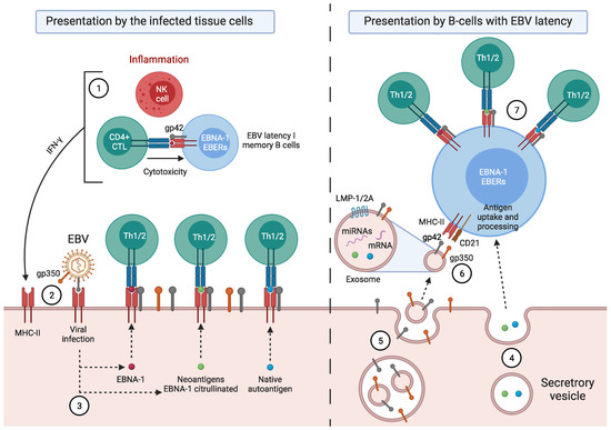 Figure 3. Model of EBV-associated autoimmune disease development. Leukocytes circulating in the peripheral blood, including EBV-latent B cells, are recruited to the affected tissues by inflammatory stimuli (infectious, autoimmune, or neoplastic processes). (1) Both the inflammation caused by the first stimulus and that caused by B cells with EBV latency allow for the activation of CD4 T lymphocytes and NK cells, releasing both IFN-γ. (2) The increase in IFN-γ induces the expression of MHC class II molecules in the cells of that tissue, converting them into nonprofessional antigen-presenting cells and allowing infection through gp42/MHC-II interaction. (3) Through MHC-II, they can present EBNA-1, peptides that undergo post-translational modifications and that can form neoantigens, such as citrullinated EBNA-1, or self-antigens that are native to the cell itself, activating CD4 T lymphocytes and generating Th1 and/or Th2 cells with an autoimmune response against the tissue cells, ultimately causing cell death. (4) Both the neoantigens and native autoantigens can be released by exocytosis, or in exosomes, and be taken up by antigen-presenting cells. (5) Exosomes can have EBV latency proteins, such as LMP-1/2A, and viral glycoproteins, such as gp350 and gp42, in their membrane, since these glycoproteins are present in the cell membrane. Upon internalization of part of the membrane, an endocytic vesicle is formed, which subsequently fuses with the early endosome. After inward budding of the endosome membrane, the intraluminal vesicles will form and give rise to exosomes. They may also contain messenger RNA (mRNA), microRNA (miRNA), and other products of EBV, such as EBV DNA. (6) Exosomes bind to EBV-latent B lymphocytes or other uninfected B lymphocytes through the interaction of gp350/CD21 and/or g42/MHC-II, releasing their contents into the cellular interior. (7) EBV-latent B cells can process and present these antigens in the MHC-II/gp42 complex, activating Th1 and/or Th2 cells with an autoimmune response against the tissue cells.