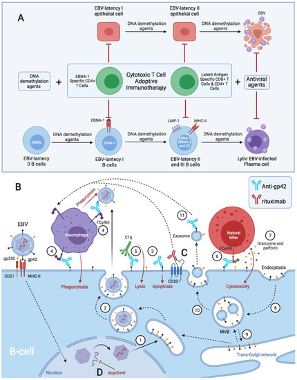 Figure 4. Different treatments against EBV latent cells. (A) Schematic model of treatment with DNA demethylation agents followed by adoptive immunotherapy of EBV-specific T cells and antiviral agents. Administration of low-dose DNA demethylation agents restores the expression of MHC class II molecules and induces the expression of LMP1, EBNA-2, EBNA3A, and EBNA-3C, allowing the transformation of EBV latency 0 and I B cells into latency II and III B cells. They also induce the transformation of EBV latency I epithelial cells to latency II. In this way, the recognition of these cells by EBV-specific T cells is improved. EBNA-1-specific CD4 T cells can only recognize latent I cells exhibiting EBNA-1 in MHC class II molecules, since EBNA-1 is poorly immunogenic. DNA demethylation agents induce lytic infection and apoptosis in EBV-transformed B cells and epithelial cells. Antiviral agents prevent viral replication. (B) Model of anti-gp42 antibody treatment. (1) Schematic representation of packaging into EBV virions, where the viral nucleocapsid acquires its final lipid envelope by budding in the trans-Golgi network (TGN). (2) It is then transported to the plasma membrane in secretory vesicles and released from the cell. Finally, after this whole process, viral glycoproteins, such as gp42 and gp350, from the secretory vesicles remain in the plasma membrane of the cell. (3) These glycoproteins can be detected by specific antibodies, such as anti-gp42. Following anti-gp42 binding, cells with gp42 on their membrane can undergo: (4) antibody-dependent phagocytosis by activated macrophages, (5) complement-mediated cytotoxicity leading to cell lysis, (6) direct death mediated by natural killer cells, (7) and antibody-dependent cellular cytotoxicity mediated by perforin and granzyme cytokines. (8) Exosome formation begins via endocytosis, where part of the membrane, together with membrane receptors and viral glycoproteins, are internalized, forming an endocytic vesicle, which subsequently fuses with the early endosome. (9) During the maturation process of the early endosome, it communicates with the Golgi apparatus through the exchange of vesicles in a bidirectional manner, forming the late endosome or multivesicular body (MVB). (10) Inward budding of the endosome membrane forms the intraluminal vesicles that will be released into the extracellular space as exosomes. (11) In the case of exosomes with viral glycoproteins present on their membrane, anti-gp42 binding triggers antibody-dependent phagocytosis by activated macrophages. (C) Anti-CD20 monoclonal antibodies (rituximab) also act through complement-dependent cytotoxicity, antibody-dependent cellular phagocytosis, antibody-dependent cellular cytotoxicity, and the induction of apoptosis. (D) Antivirals prevent viral replication by inhibiting viral DNA synthesis.