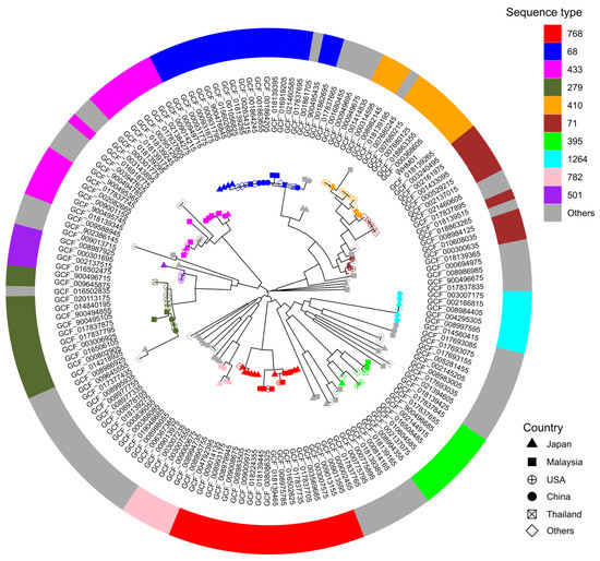 To explore the relationships between WHM01 and 156 A. nosocomialis isolates with public genome data, a phylogenetic tree based on a core-genome SNP alignment was reconstructed and integrated with the bacterial sequence types in Figure 2 (see more details in Table S3). The SNP distance matrix of pairwise genomes of A. nosocomialis is shown in Table S4. Among all the strains, 33 STs were detected, and 13 strains were assigned to the novel STs. The top five prevalent STs were ST768 (19 strains), ST68 (18), ST433 (13), ST279 (12), and ST410 (10), respectively. The strain WHM01 was most closely related to the ST410 strain AC1892 (GCF_018139265) isolated in Malaysia, 2018. The genetic distance between the strains WHM01 and AC1892 was 206 SNPs. In terms of geographical distribution, the top five countries were Japan (39), Malaysia (37), America (22), China (17), and Thailand (10) (Figure 2). The ten strains belonging to ST410 were sampled from America (5), the Czech Republic (1), Iraq (1), Malaysia (1), Japan (1), and China (1). Meanwhile, the topology of the strain tree of A. nosocomialis was also investigated, based on the sequence alignments of core genes present in all the genomes and seven MLST loci, respectively. A total of five major evolutionary branches were observed and consistent between the core SNP (Figure S2A) and core genome trees (Figure S2B), whereas the corresponding topological pattern was inconspicuous in the MLST-based tree (Figure S3). The strains belonging to the same STs tended to be clustered together, e.g., ST768 (19), ST395 (8), ST1264 (6), and ST782 (5). Clade IV was exclusively composed of the ST768 strains. The strains of ST410 were clustered into the branch of Clade I and closely related to the strains of ST71. Notably, the subclade of ST410 strains encompassed a strain (GCF_018139195) that was assigned to a novel ST (20-24-26-14-26-16-23).