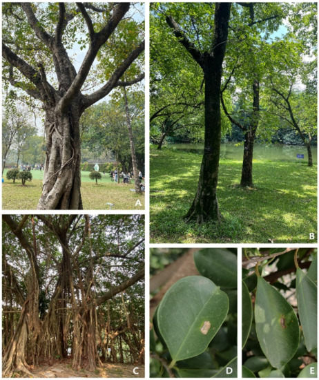 - Villard, C.; Larbat, R.; Munakata, R.; Hehn, A. Defence mechanisms of Ficus: Pyramiding strategies to cope with pests and pathogens. Planta 2019, 249, 617–633. [Google Scholar] [CrossRef]