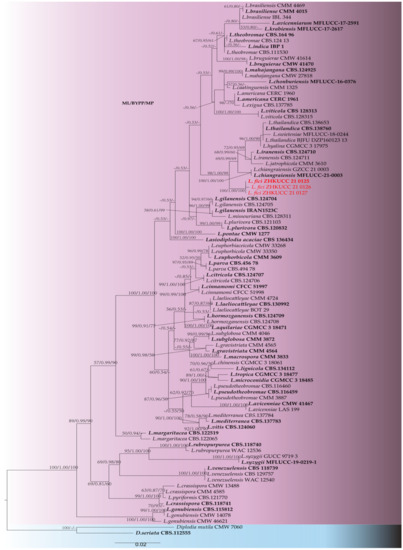 - Wu, N.; Dissanayake, A.J.; Chethana, K.T.; Hyde, K.D.; Liu, J.K. Morpho-phylogenetic evidence reveals Lasiodiplodia chiangraiensis sp. nov. (Botryosphaeriaceae) associated with woody hosts in northern Thailand. Phytotaxa 2021, 508, 142–154. [Google Scholar] [CrossRef]