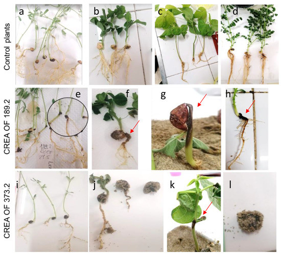 4.4. Pathogenicity Test of M. phaseolina CREA OF 189.2 on Chickpea and Host Range
