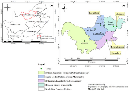 The map where the samples were collected ((A) represents the map of the North West province, and (B) represents the map of the districts and towns).