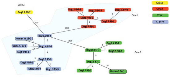 The human isolate, and all isolates from dog 1 and dog 3, belonged to ST241. The ST241 isolates from dog 1 and dog 3 differed by between 0 and 9 SNPs, whereas the human isolate showed 87 SNPs differed from its closest related canine isolate (dog 1). In the MS-tree, the SNPs were filtered for recombination and the 87 SNPs between dog and human isolates were not clustered in one location on the genome, indicating that these SNPs were not the result of a single recombination event. Isolate 17S01590-2 of dog 2 displayed 7835 SNPs compared to its closest relative, belonged to ST940, and was considered genetically unrelated to other isolates (Figure 1). All isolates of household 2 carried the p222 plasmid (coverage 97%, identity 99%) [9] and other predicted plasmid sequences. The BLASTn analysis of these contigs identified sequence homology with the PRE-25-like element [10], carrying sat4; ant(6)-Ia; aph(3’)-III; cat(pC221); and erm(B) resistance genes (coverage 67.9%, identity 99.9%) in all these isolates. A 2.7 kb plasmid sequence in all ST241 dog isolates belonged to the rep21 gene plasmid family (Table 1).