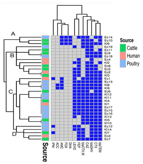 A heatmap supported by a dendrogram showing the distribution of the antimicrobial resistance genes and resistance phenotypes among the examined Escherichia coli and Klebsiella isolates from humans, cattle, and poultry. Dark blue squares indicate resistance genes and phenotypic resistance; gray squares indicate absent genes and phenotypic susceptibility. Four clusters (A–D) are indicated in the figure.