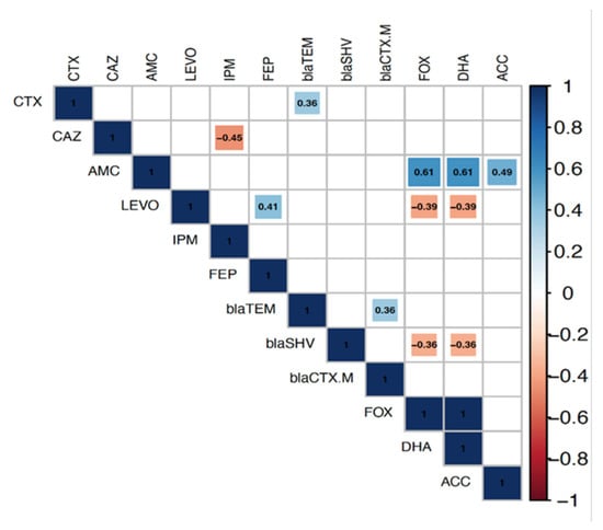 The correlation analysis determined the relationship between the antimicrobial resistance genes and phenotypic antimicrobial resistances among the isolates. Significant positive correlations were observed for the co-occurrence of resistance genes and phenotypic resistance to their corresponding antimicrobials. The AmpC genes blaFOX, blaDHA, and blaACC were significantly and positively correlated with AMC, and the correlation coefficients (r) were 0.61, 0.61, and 0.49, respectively. Furthermore, the blaTEM gene showed a significant positive association with CTX (r = 0.36). On the other hand, significant negative correlations were found between resistance genes and antimicrobials other than the corresponding ones, i.e., blaFOX and blaDHA genes with LEVO (r= −0.39). Concerning the gene/gene relationship, a significant positive correlation was observed for the co-existence of blaTEM and blaCTX-M genes (r = 0.36). In contrast, significant negative correlations were found between AmpC genes, blaFOX and blaDHA, and the blaSHV gene(r= −36) (Figure 2).