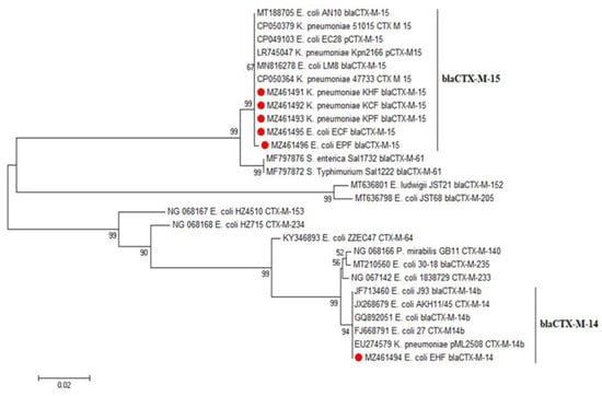 The data shown in Table 4 represent the samples selected for sequence analysis based on the CTX-M gene. It was found that all of the samples were genetically related to CTX-M-15, while only one E. coli sample isolated from humans was associated with CTX-M-14. This high rate of CTX-M-15-containing isolates is a potential risk. This genotype is evolving worldwide, and is linked with multidrug-resistant pathogens, causing community and hospital-acquired infections [32,33]. This high detection rate of blaCTX-M-15–containing isolates agreed with the preceding records on blaCTX-M-15 being the most frequent ESBL in the Middle East and North Africa [34]. This high prevalence of the blaCTX-M-15 allele might owe itself to the potent ability of its gene products (CTX-M-15 and its variants) to break the structure of ceftazidime, cefotaxime and aztreonam, which possibly provides the bacteria with a selective advantage, especially when various antibiotics are concurrently or successively prescribed. This high genetic matching can suggest the zoonotic transmission of strains between human and animal populations. This finding was in harmony with [35], who identified the same type of CTX-M (blaCTX-M-15) among ESBL-E in Egypt, and [36], who detected blaCTX-M-14, -15, -27, and blaCTX-M-55 variants in various animal species; their presence could be an indication of transmission between humans and animals because these strains have been associated with the global spread of blaCTX-M in human clinical isolates [7]. Figure 3 displays the phylogenetic tree of the current CTX-M type class A β- lactamase and other published CTX-M sequences showing high genetic similarities (99% identity), which may explain the possibility of the exchange of this resistance gene between species in some Egyptian districts.