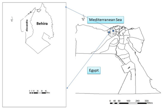 Samples were collected from various humans, cattle, and poultry in several districts of the Behera and Alexandria Governorates in Egypt from January to May 2020 (see Figure 4). One hundred and forty specimens were gathered from human contact workers, dairy cattle, and broiler chickens, including human fecal samples (n = 20) from the workers, rectal swabs (n = 34), milk (n = 14), milking machine swabs (n = 8), rations (n = 2) and water (n = 2) from the cattle farms. Furthermore, cloacal swabs (n = 45), rations (n = 5), water (n = 5) and litter (n = 5) were taken from poultry farms. All specimens were taken and transferred in an ice box to the Animal Hygiene and Zoonoses Department laboratory, Faculty of Veterinary Medicine, Alexandria University for bacteriological analysis.