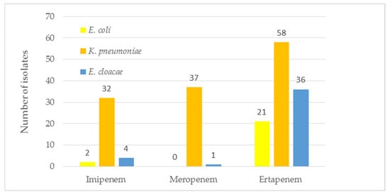 According to the EUCAST guidelines for the detection of carbapenemases, it is recommended to test all Enterobacteriaceae with reduced sensitivity to ertapenem or meropenem [,]. In these studies, the values in Table 1 were used as susceptibility breakpoints.